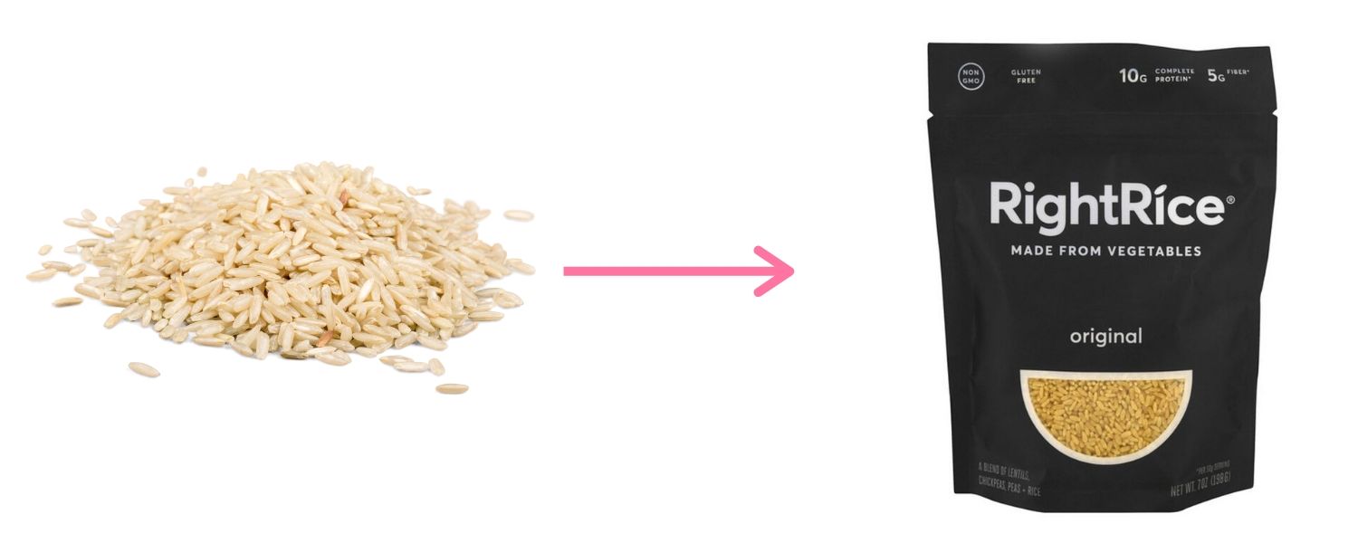Right Rice is made from veggies like lentils, chickpeas, and green peas. They come in a variety of flavors. There are 30g of carbs and 25g of net carbs in 1/3 cup or 50g uncooked, compared to 40g of carbs and 39.3g of net carbs in long grain white rice, uncooked.