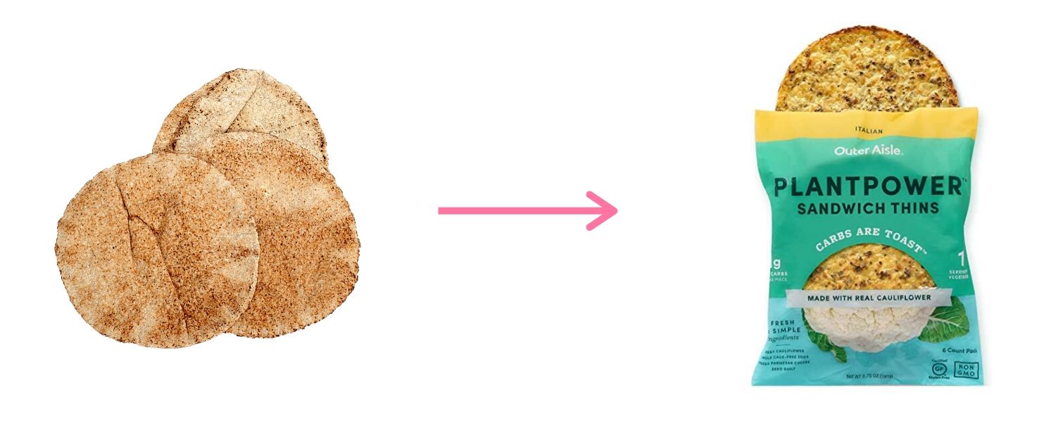 These cauliflower sandwich thins are a really great replacement for bread. You can toast them and make sandwiches with them. For 1 slice (31g), they have 2g of carbs and 1g net carb, compared to 1 slice of white bread (30g), which has 15g of carbs.
