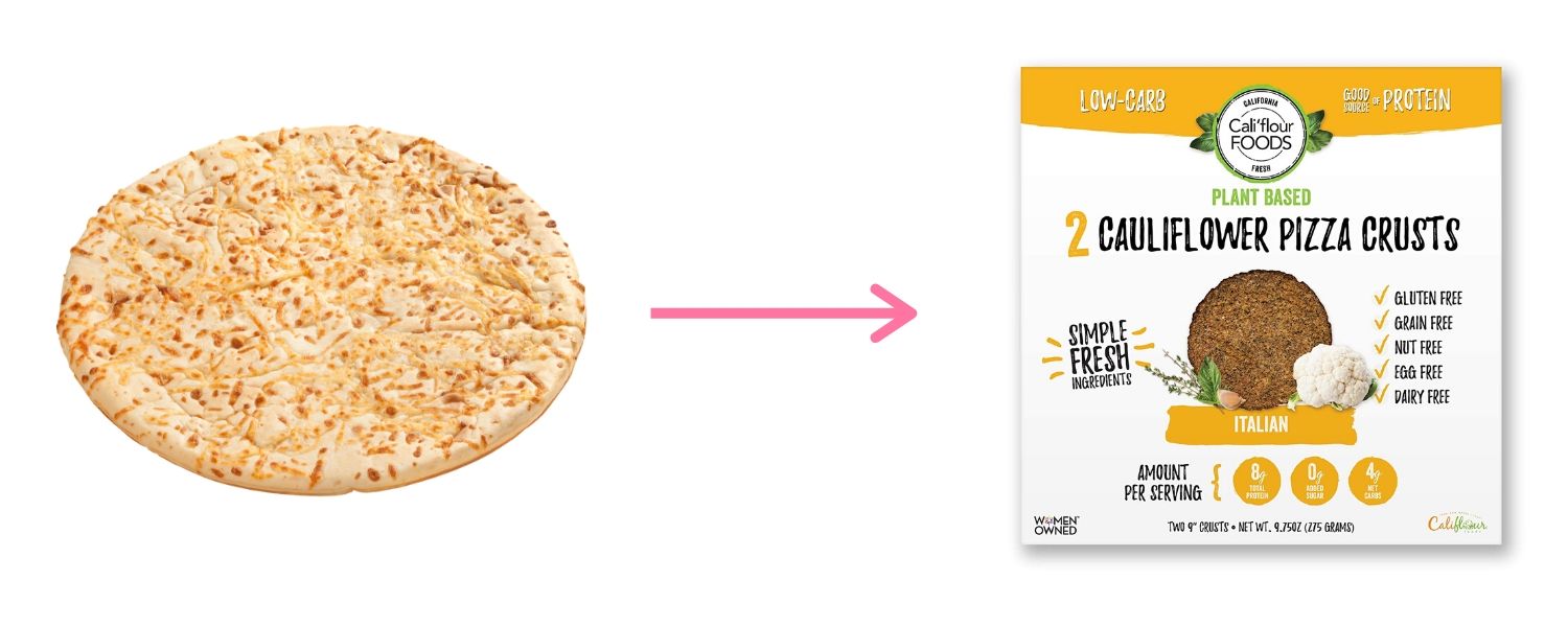 We love Cali’flour Foods for their cauliflower pizza crust. They have different flavor options & plant-based ones as well. There are 2g of carbs and 1g net carb in 46g, compared to 24g of carbs in wheat crust.