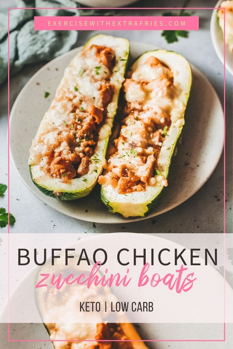 These buffalo chicken zucchini boats are perfect for anyone looking for a low carb dinner option! It’s super simple to make. All you have to do is hollow out zucchini, stuff with chicken and buffalo wing sauce, top with cheese, and bake!