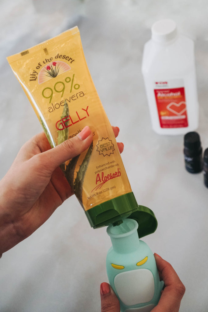 You can put your hand sanitizer mix in either a spray or squeeze bottle. Please be sure to use a toxin-free plastic or glass bottle! We got the penguin bottles on Amazon, but recommend getting a clear bottle like this so you can see how much alcohol you’re pouring in.