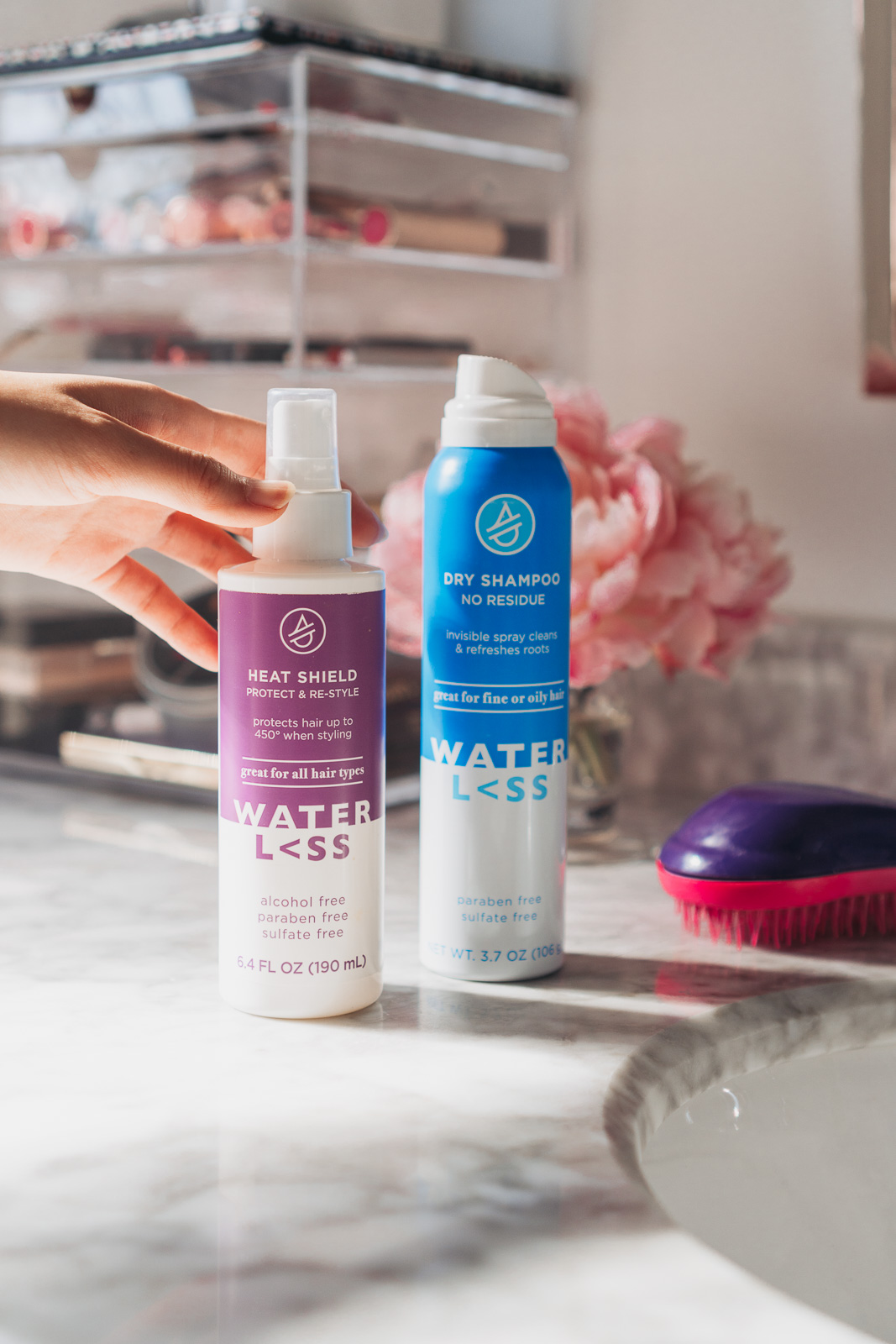 Afterwards, we like to heat style our hair. We always use the Waterl<ss Heat Shield Protect and Restyle before straightening our hair to protect it from our hot tools. We shake, section off our hair, spray into each section, then straighten our hair. These products are available online at Target!!