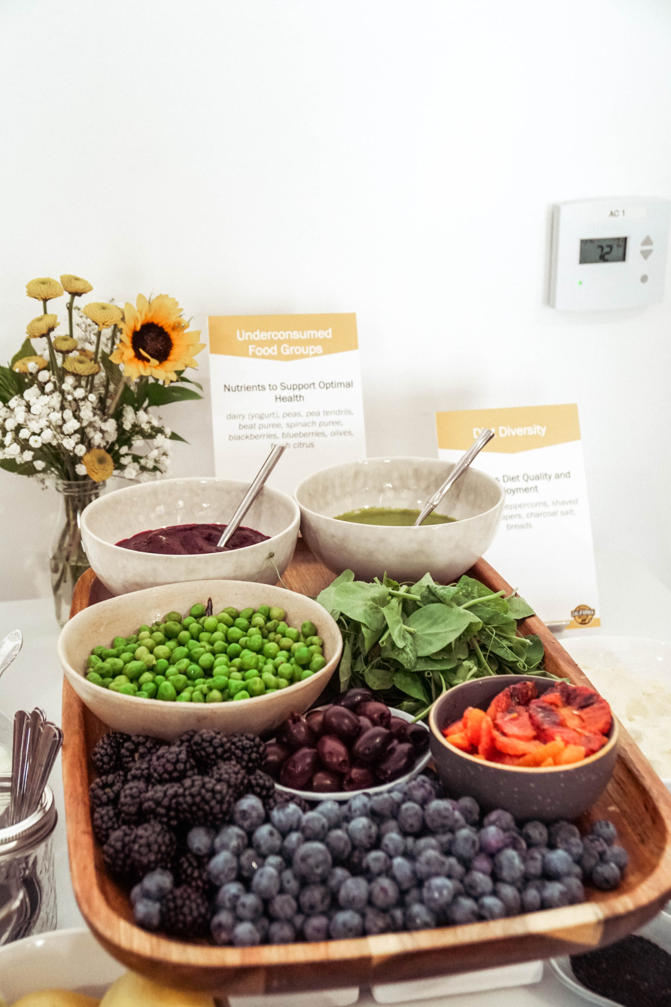 Underconsumed food groups provide nutrients to support optimal health. They provided us with peas, pea tendrils, beet puree, spinach puree, blackberries, blueberries, olives, and fresh citrus.