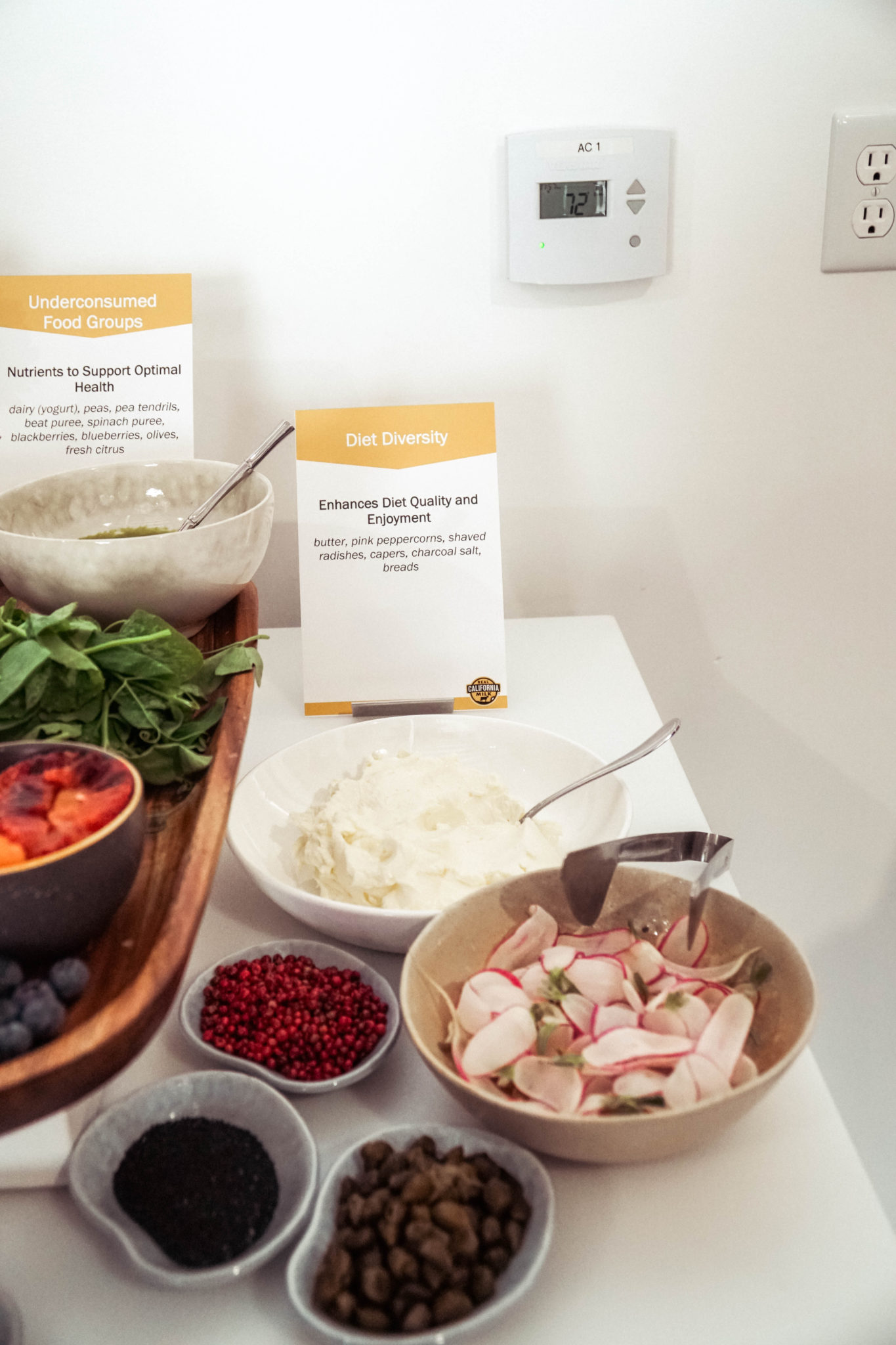 Diet diversity enhances diet quality and enjoyment. The finishing touches provided here included butter, pink peppercorns, shaved radishes, capers, charcoal salt, and breads.
