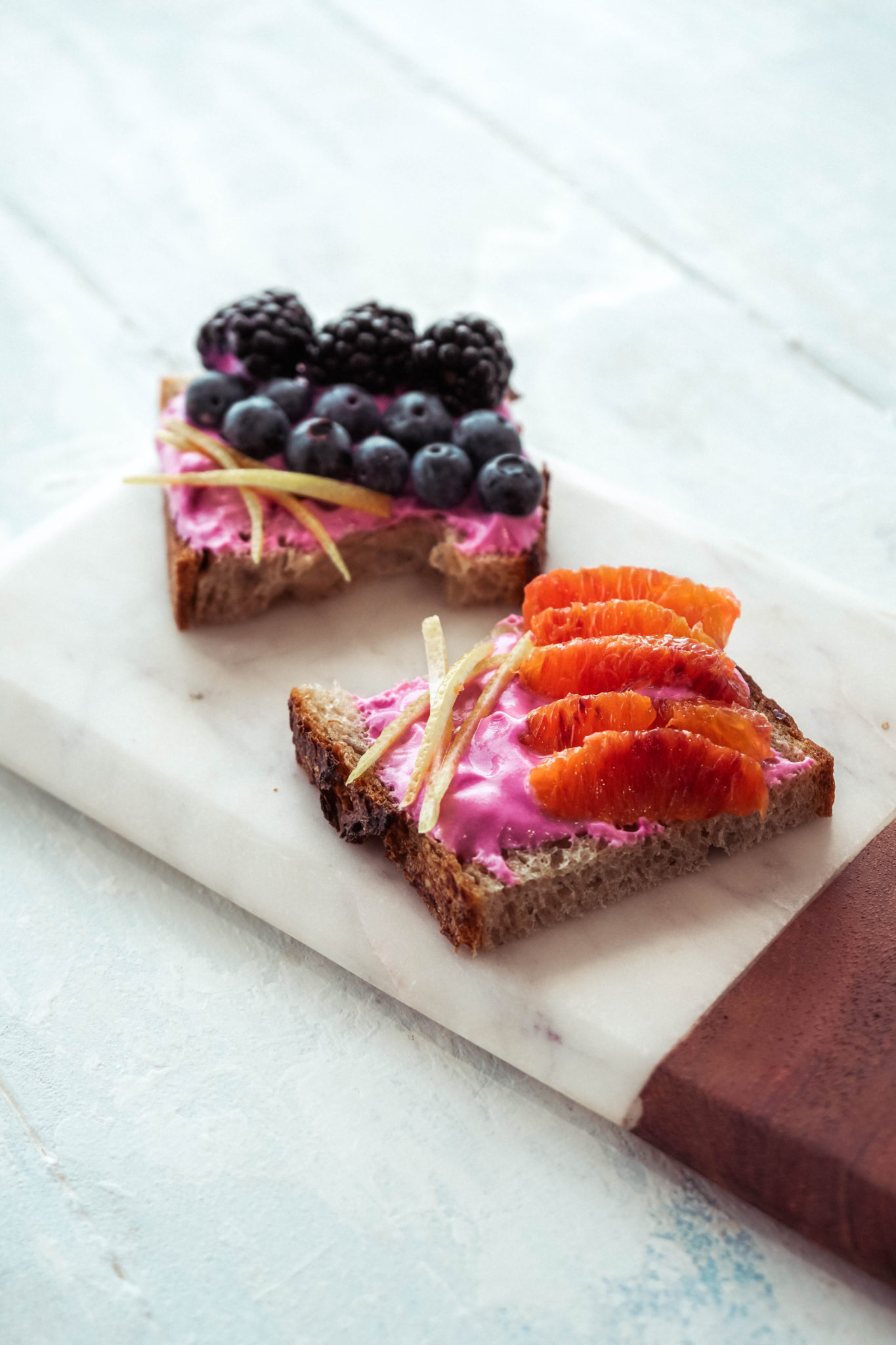 We mixed our whole fat yogurt with beet puree for our sweet crostini to add an amazing color to our base and topped it with berries and blood orange.